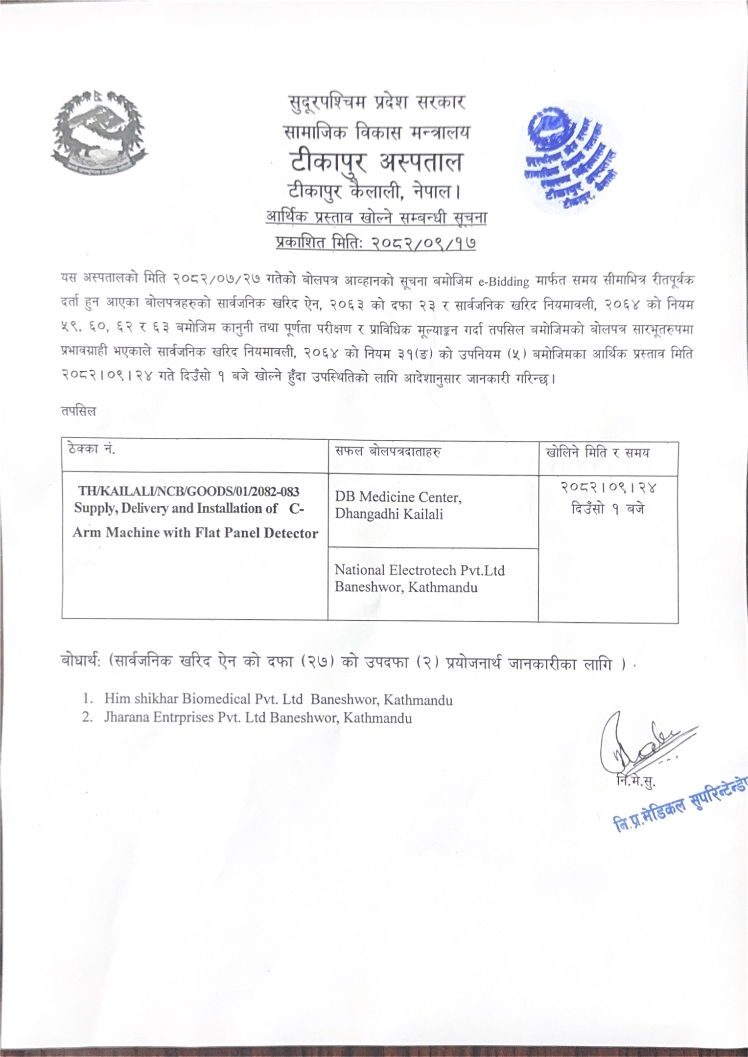 सी-आर्म मेसिनको आर्थिक प्रस्ताव खोल्ने सम्बन्धी सूचना 2082-09-17